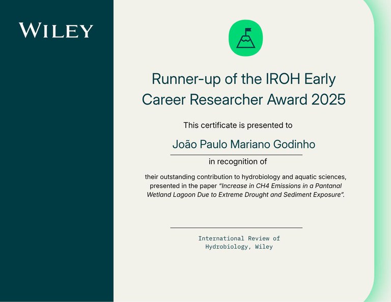 O artigo do Dr. João Paulo Godinho, Increase in CH4 Emissions in a Pantanal Wetland Lagoon Due to Extreme Drought and Sediment Exposure. https://onlinelibrary.wiley.com/doi/10.1002/iroh.70021, foi selecionado pelo Conselho Editorial da revista International Review of Hydrobiology para o Terceiro Prêmio do IROH Early Career Researcher Award 2025.